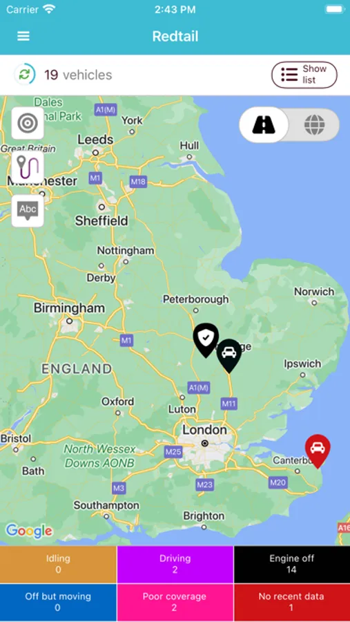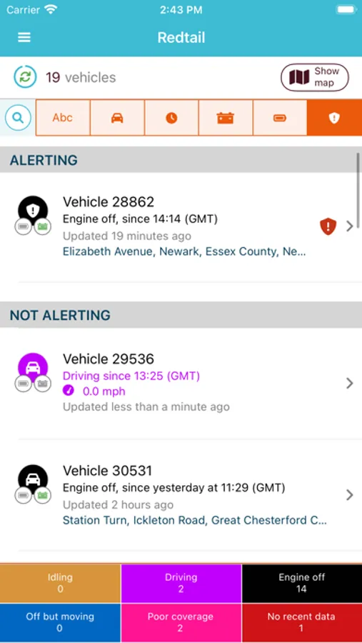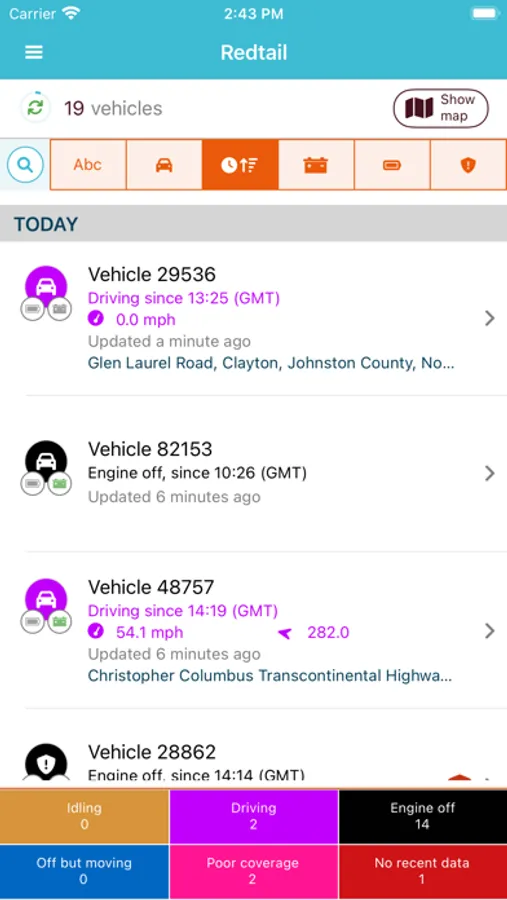 • Identify vehicle activity by colour (driving, idling, engine off, etc.)