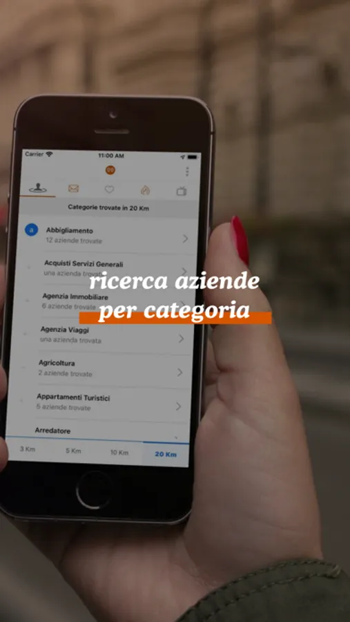 Selezionando l'area chilometrica, way-commerce visualizzerà un elenco organizzato in categorie commerciali.