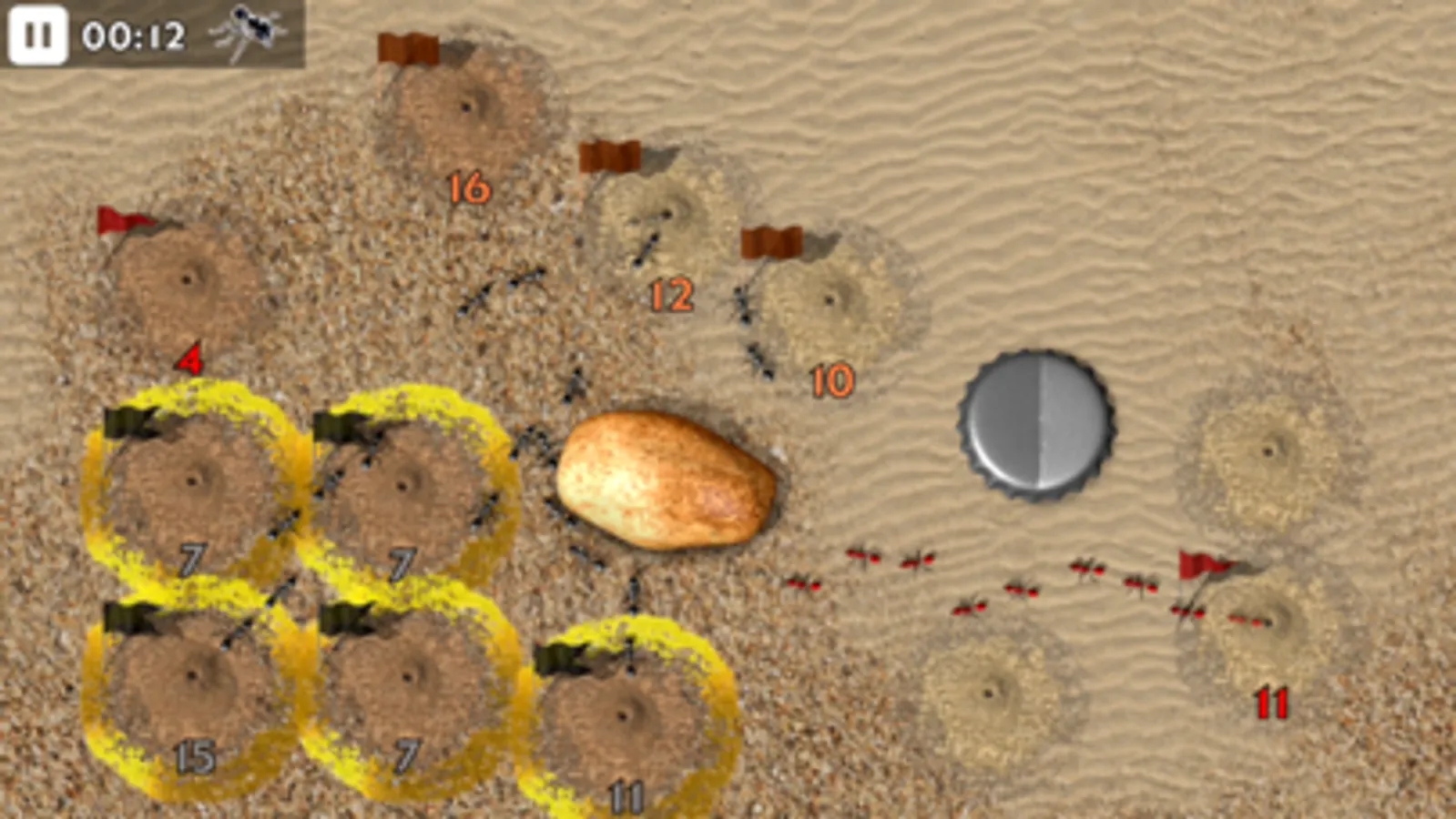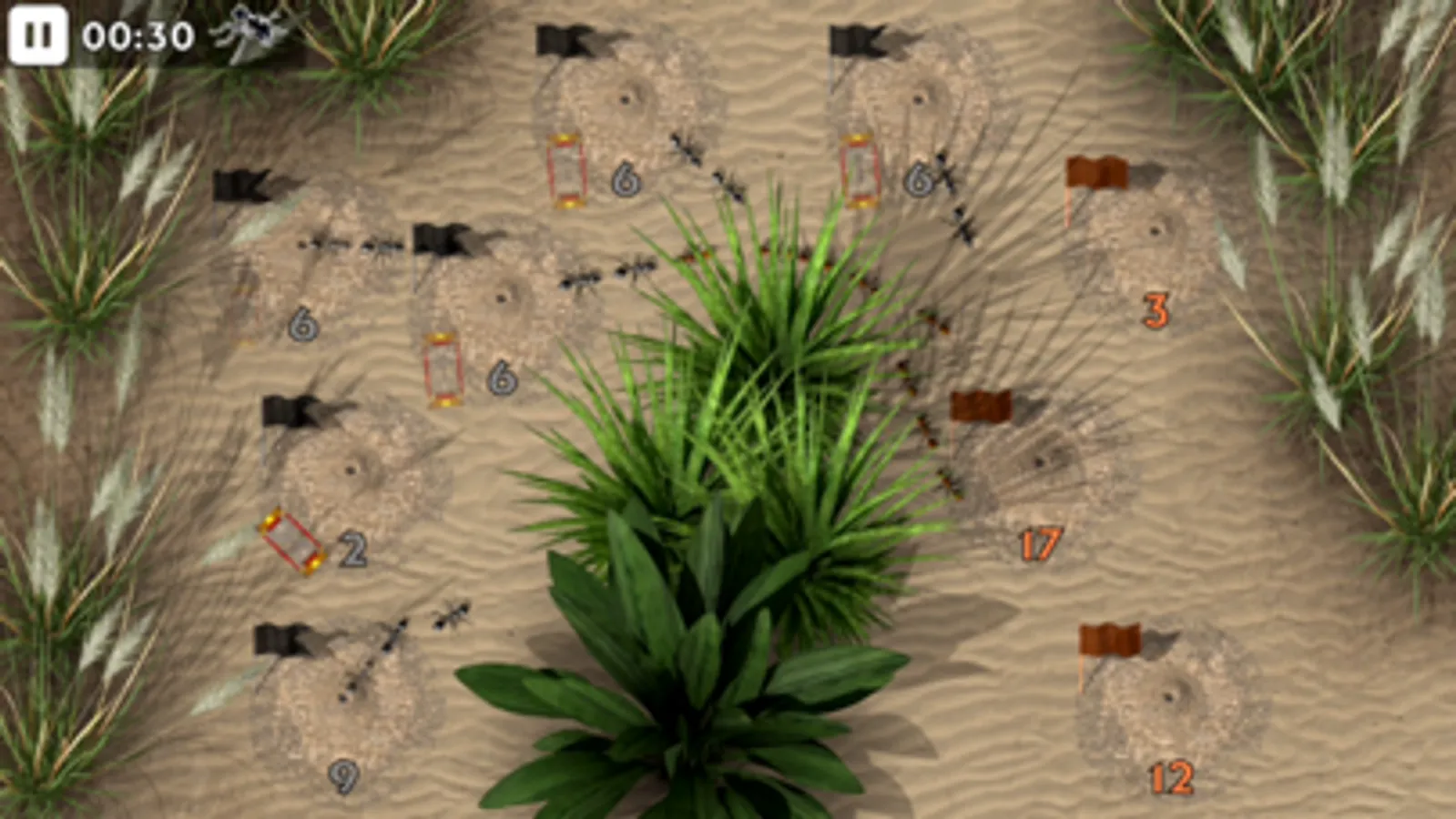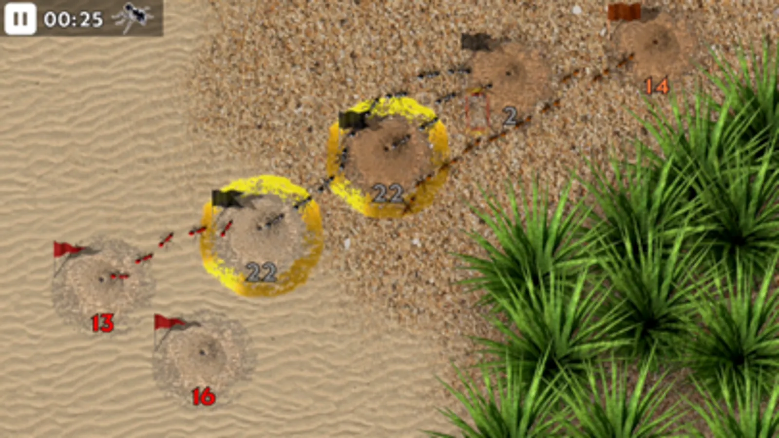 Take out all of the hives by occupying the empty ones and attacking the others taken by your enemies. You gain score after completing a level. You can also collect stars and keys. The faster you complete, the fewer ants you loose, the more you get.