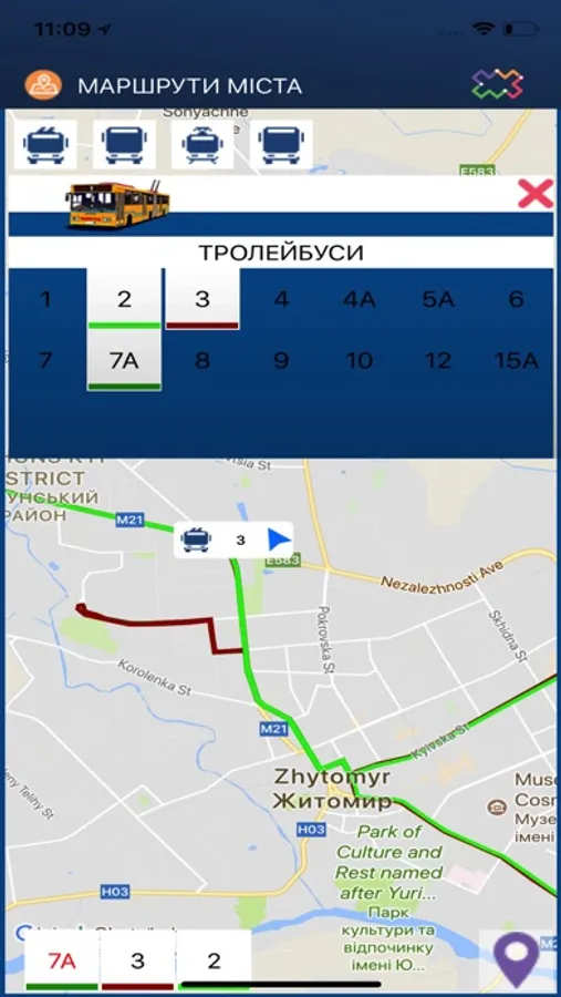 - show on the map a complete list of city transport routes, both municipal trolleybuses and private buses;