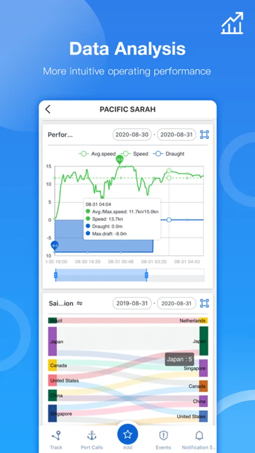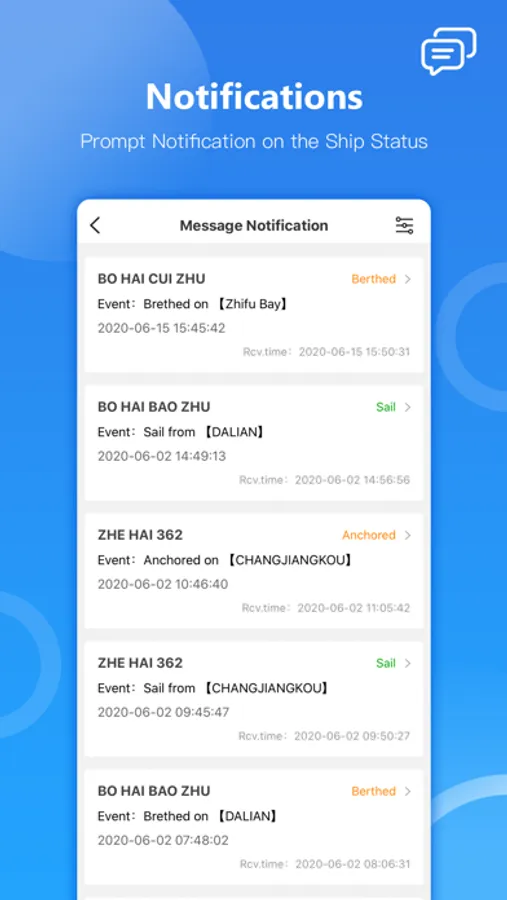 • Navigational status and departure information of each ship, anchoring, berthing, and leaving