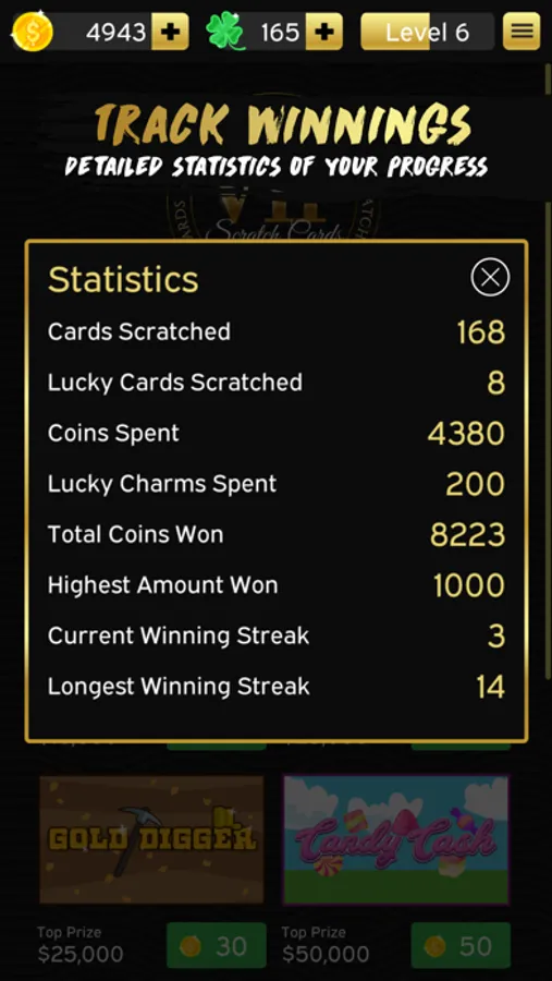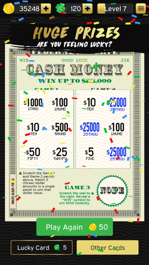 Level up and unlock new scratch cards progressively as you play. Scratch off bonus panels to win bonus money.