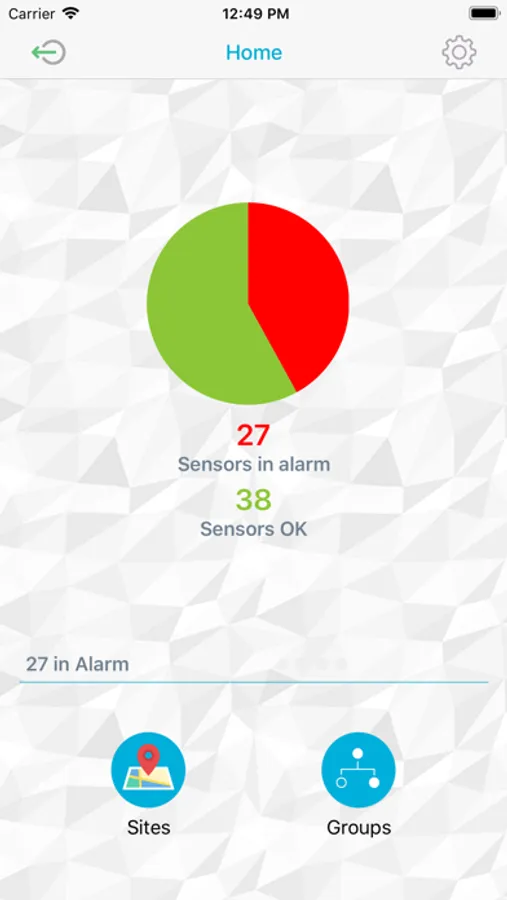 Alarm screen; status of groups, sensor names, alarm reading. Further data can be accessed upon user interaction, such as alarm detail per sensor.