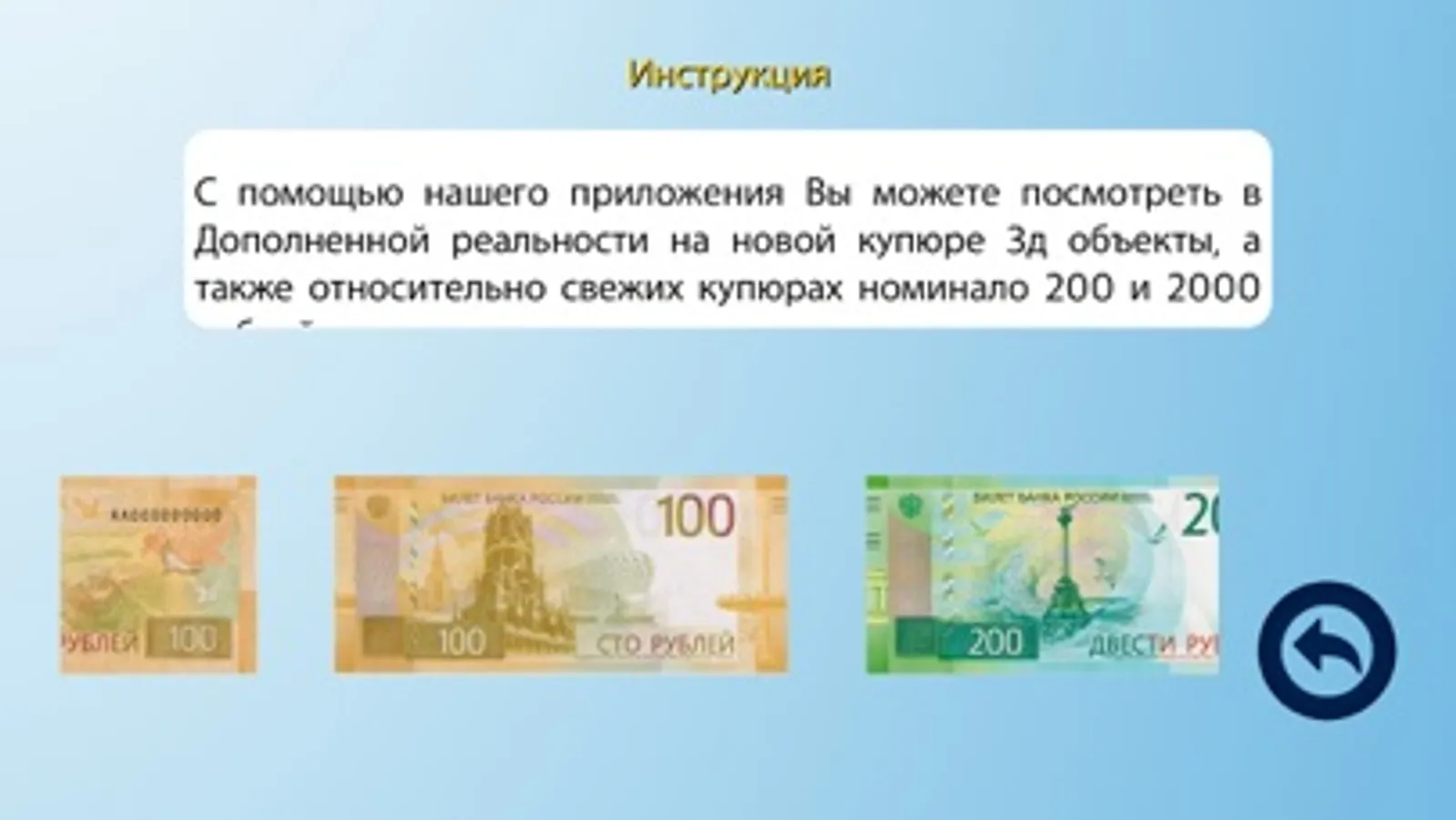 Для использования функции дополненной реальности в приложении Вам необходимо иметь изображение купюр Российской Федерации, если у Вас не оказалось их под рукой, то вы можете воспользоваться сайтом https://izyapp.ru/ios/bank2/