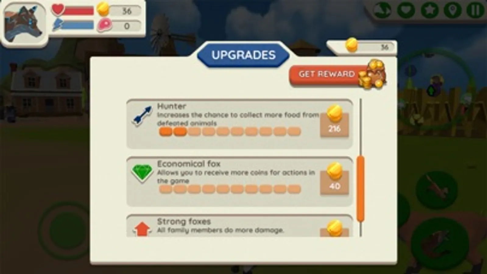 The game has the ability to improve the individual characteristics of family members and characteristics that affect all foxes in the family at once. Do not forget to improve the characters! Get experience doing tasks and hunting. After receiving a level, the character can spend it on points of attack, energy or life. There are also special skills that allow you to increase speed, collect more food, get more resources for actions in the game, etc.