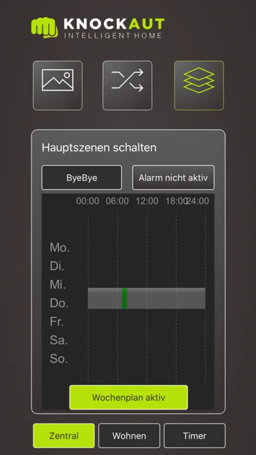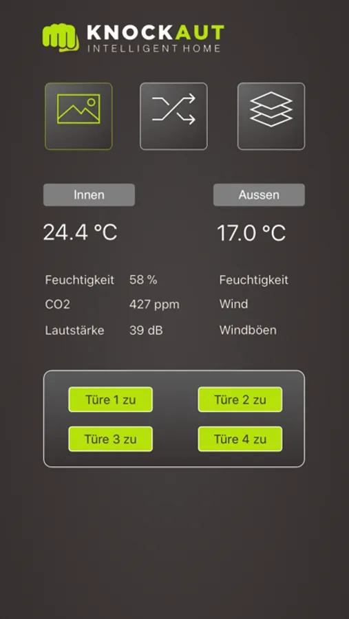 Diese APP erfordert die Installation eines KNOCKAUT® TITAN Professinal Controllers mit gültiger Lizenz. Zusätzlich muss die entsprechende Hardware der Gebäudeautomation installiert sein. Jegliche Kategorien, Variablen und Geräte, die auf den Screenshots zu sehen sind, sind Muster eines Beispielobjektes. Ihre KNOCKAUT® TITAN VIEW Mobile APP gestaltet sich individuell anhand der Konfigurationen Ihres KNOCKAUT® TITAN-Controllers.