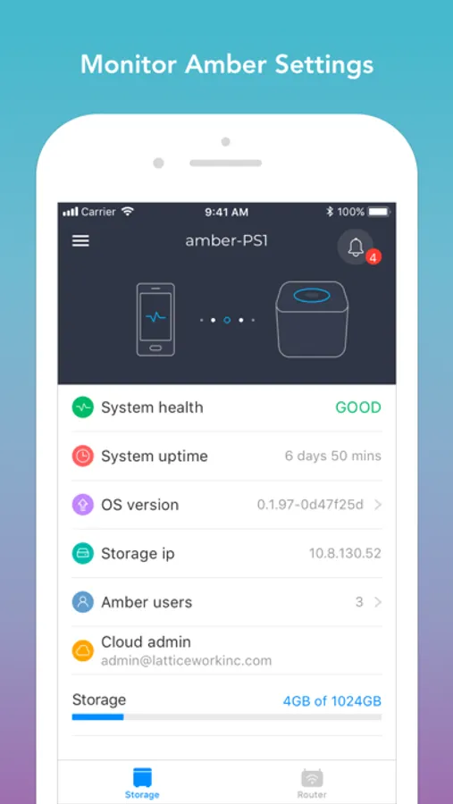 - Monitor Amber storage and control router settings.
