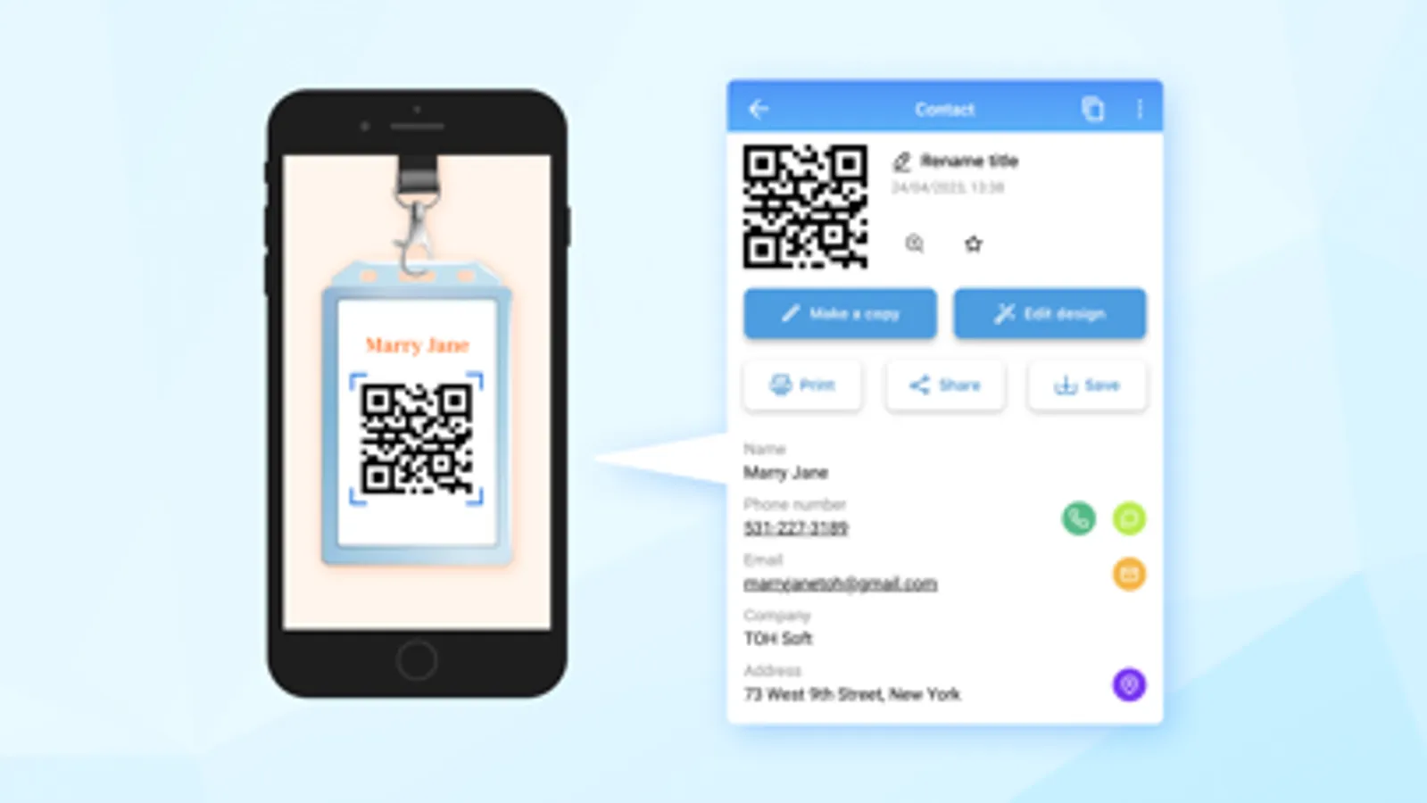 Scan free QR code reader and read contact information with QR scanner options as call, email, add to contact and share!