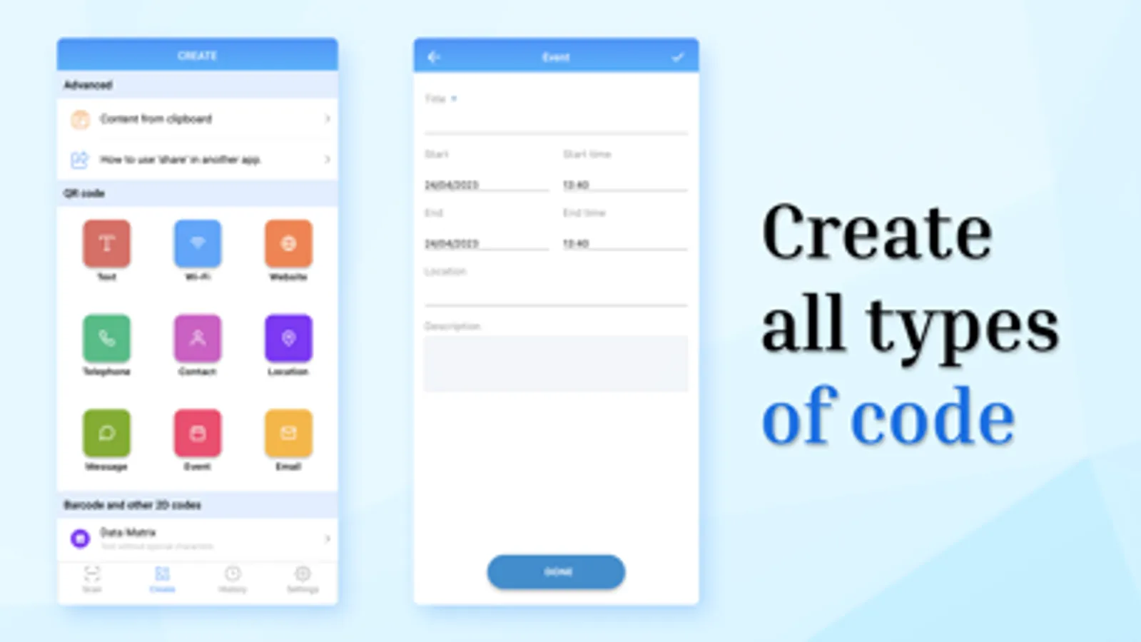 Scan all types of codes quickly, instantly with QR code generator via camera or from photo albums!