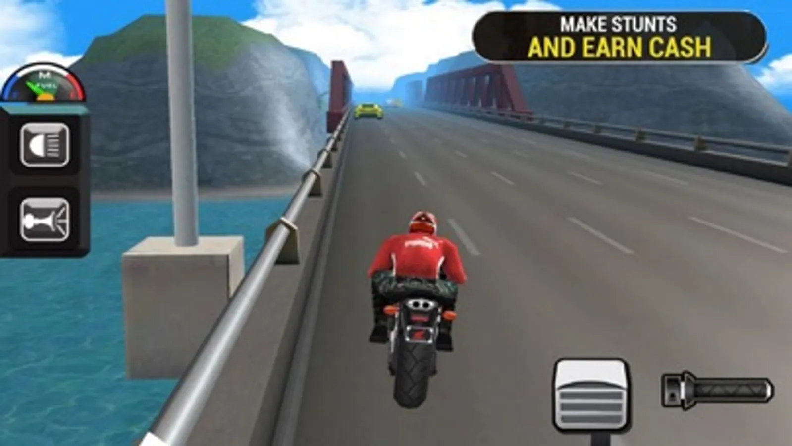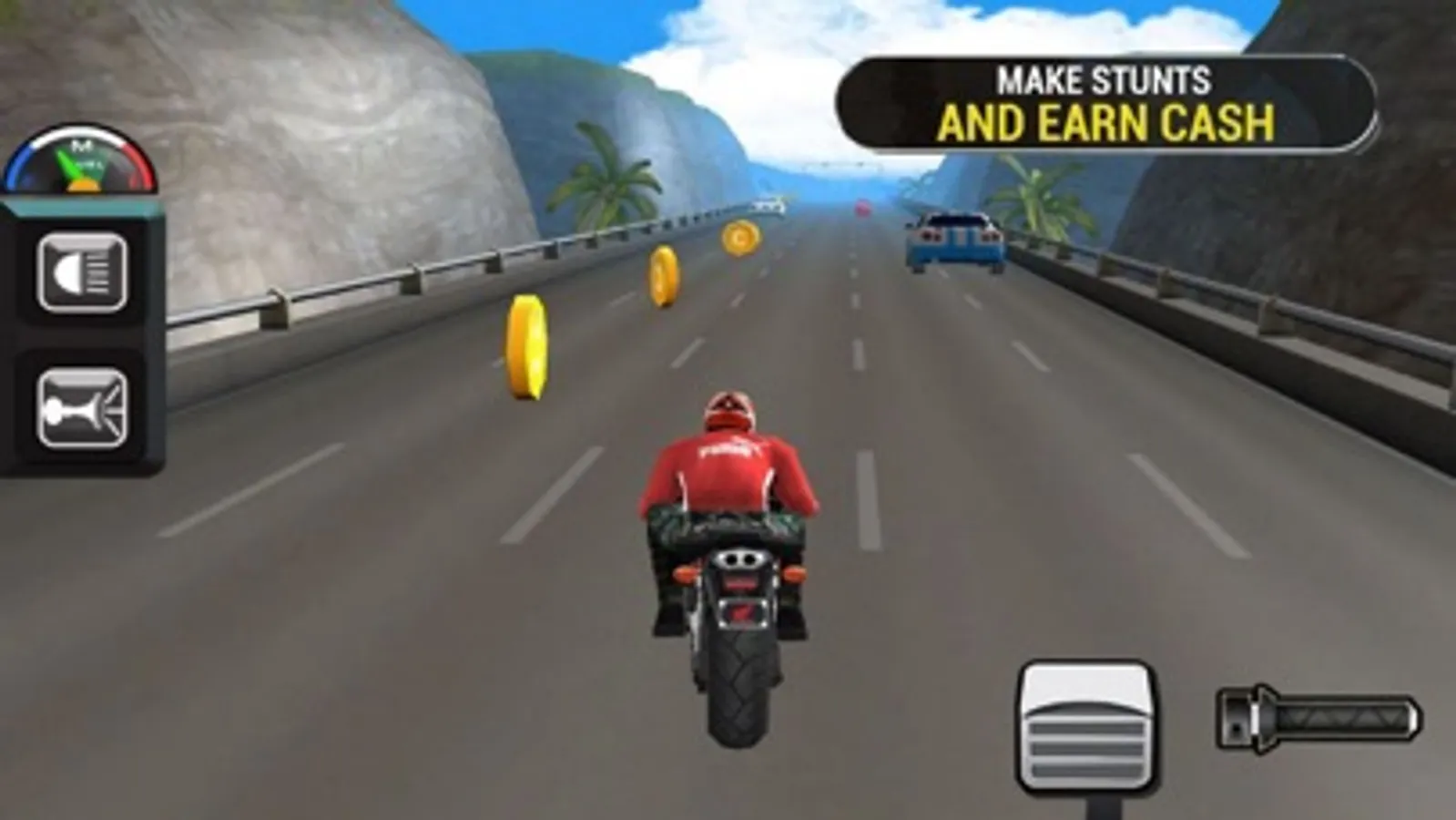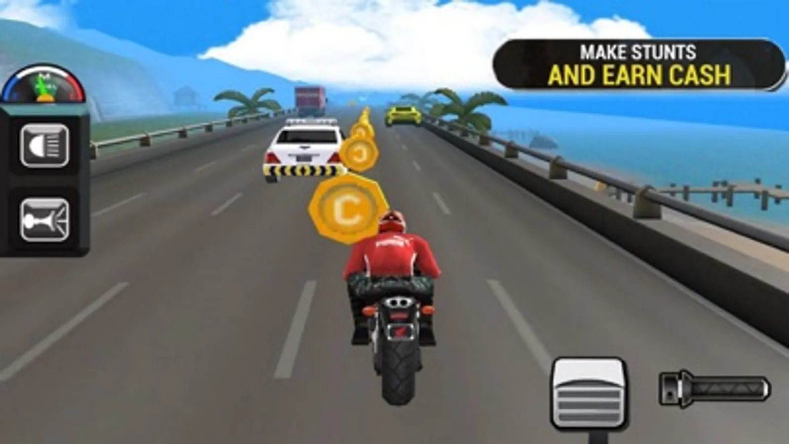 Drive your motorbike as fast as you can, only to keep the performance to speed up in the highway. jump on your racing bike and ride in the endless busy roads and highways! make near traffic discovering 4 unique locations. never forget that riding a motorcycle can be fun, but it can also be dangerous!
