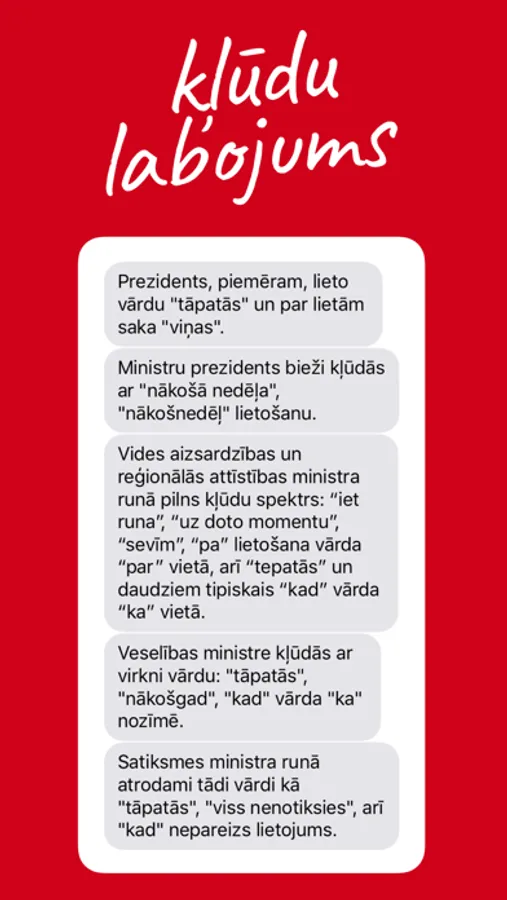 Kļūdu labojums ir vienkārša aplikācija, kas palīdz izlabot visa veida latviešu valodas kļūdas. Kļūdu labojums ir veltīts visiem latviešiem un it īpaši politiķiem, kuri nekad nav spējuši tikt galā ar pareizu "kad" lietošanu.
