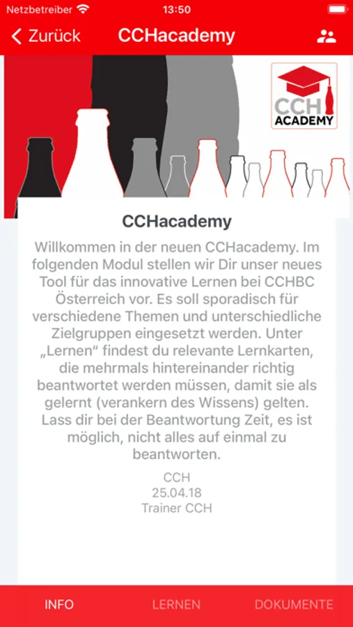 Wissen und Fähigkeiten sind die Grundlagen für Kompetenz, die CCHBC und unsere Mitarbeiter(innen) erfolgreich macht. Die App „CCHacademy“ bietet ihnen Zugriff auf ausgewählte Schulungen.“