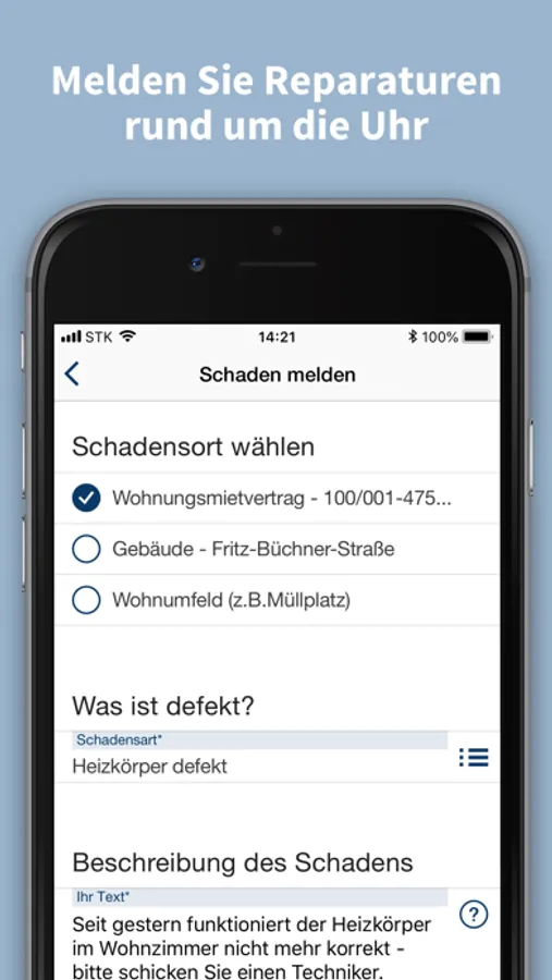 • Aufruf Ihrer KoWo-Vertragsdokumente sowie Nebenkostenabrechnungen Meldung von Reparaturen rund um die Uhr, inkl. Hochladen von bis zu zwei Fotos. Auch als nicht autorisierter Mieter können Sie uns einmalig einen Schaden melden