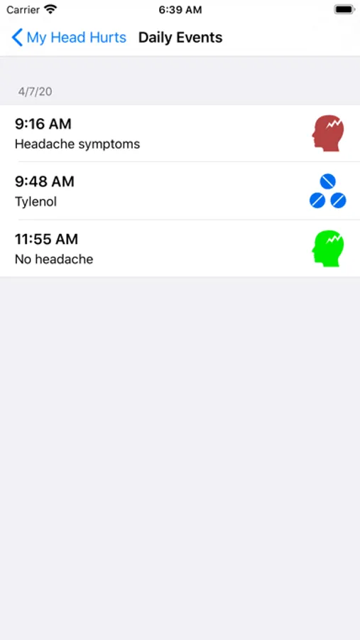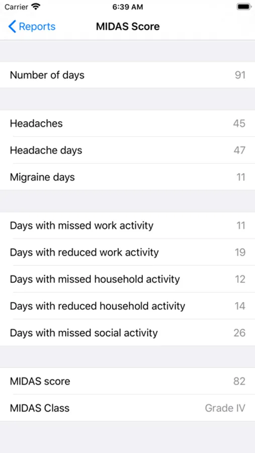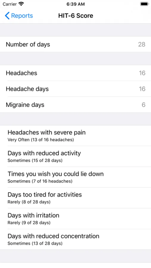 By tracking your headache symptoms, My Head Hurts can provide accurate HIT-6 and MIDAS scores, which are commonly used to assess the impact of migraine headaches on everyday life. My Head Hurts can also help you determine common days of the week or times of day when headaches are most likely to occur, helping you determine factors that may increase the likelihood of headaches.