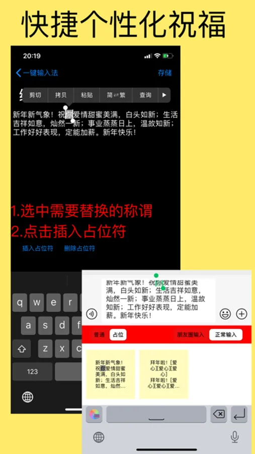 同时一键输入法还可以快手速输入祝福短语并替换关键词,个性化节日祝福语发送更简单。