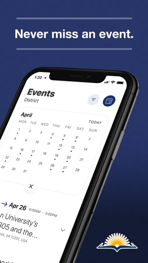 The event section shows a list of events throughout the district. Users can add an event to their calendar to share the event with friends and family with one tap.