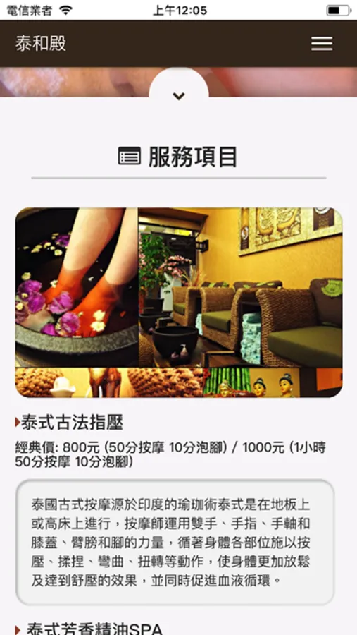 泰式按摩是古代泰王招待皇家貴族的最高禮節,可舒緩疲勞,釋放壓力,促進血液循環,泰式按摩師從足部開始透過推、拉、扳、按、壓、揉、拿身體的各部位,促進血液加速循環,致使身體放鬆。泰式按摩的動作看似用力其實極為柔和,按摩師巧妙地運用手、肘、膝、大腿等肢體借力使力,再加上類似音樂節奏富有節拍性地輕緩柔急地按壓,讓人忘我地、漸次地達到放鬆效果,又有被動式瑜珈之稱,現在您不必遠赴泰國,來一趟泰和殿泰式SPA養生會館給您平民的價格、貴族的享受。