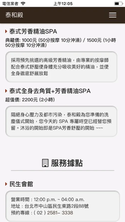 本館一向秉持以客為尊的態度,提供深層油壓、全身按摩、去角質等一流且專業的服務,並已以「賓至如歸」為目標,用心塑造舒適優雅且具異國風情的環境空間,讓您放鬆心情,再藉由專業的按摩,達到身心舒暢的效果,在此我們期待您的光臨