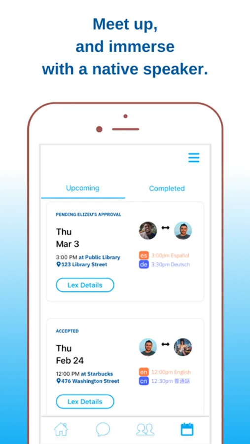 Meet in-person at one of our suggested meeting locations. Immerse with a native speaker, for free! You don't have to pay a private tutor - just help them learn your native language!