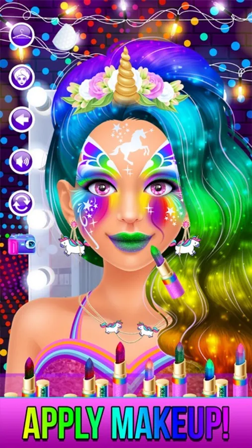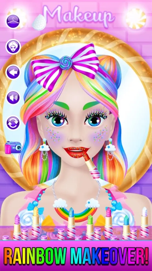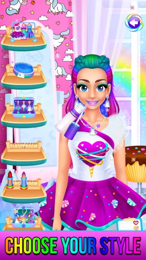 Level 5 : Get a makeover with rainbow unicorn, candy or rainbow princess! Apply make-up, change outfits, brush hair and much more!
