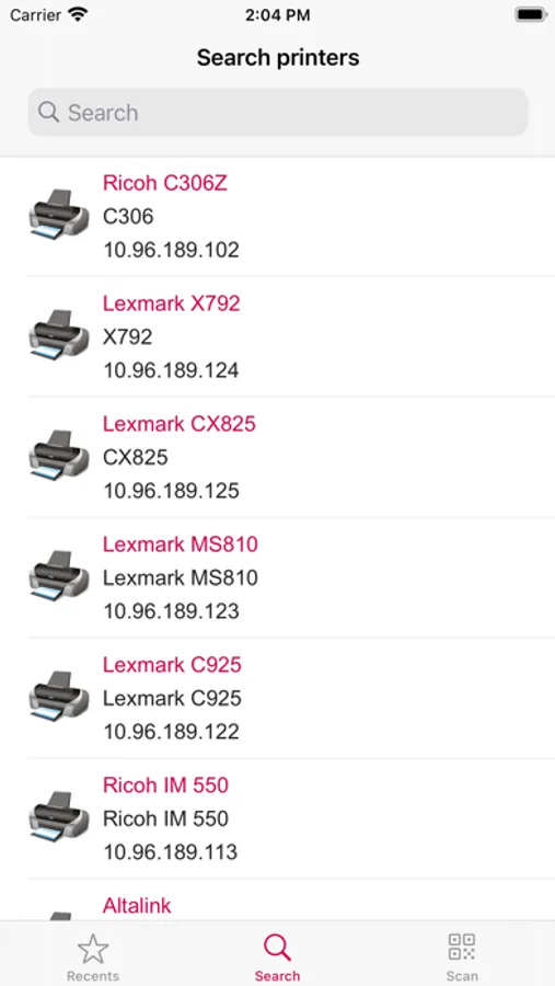 The user can select a printer from a list, by scanning a QR-code located on the printer, or by manually typing either IP address, brand or model name. The last used printers are stored in a separate list easily accessible.