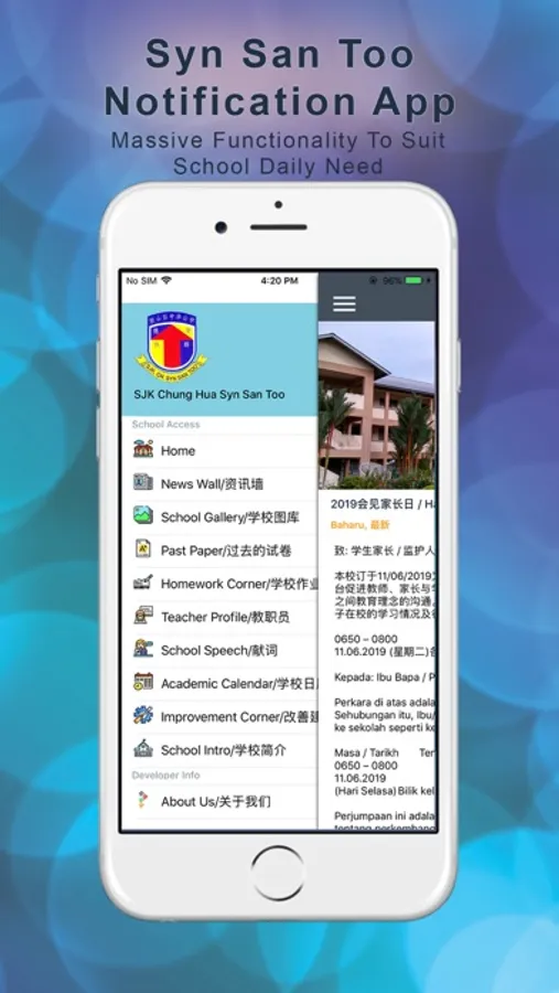 1. Parents who have installed this app will get notification on their smartphone. By tapping on the notification, they are able to view the announcement content. Likewise, they can open the app manually on regular basis to check on the school’s news.