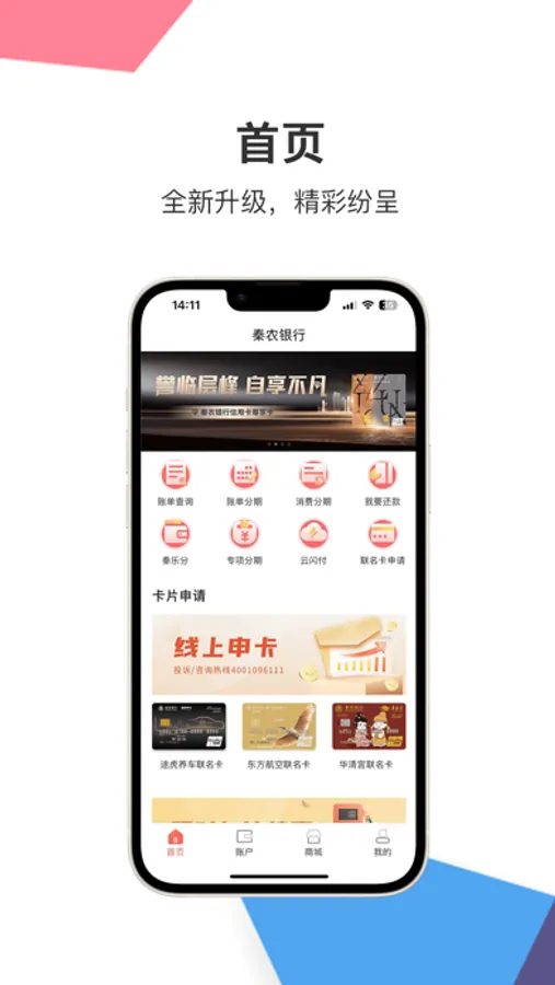 秦之道是秦农银行信用卡官方客户端,设计简洁流畅,持卡人可享受7*24小时贴身的信用卡服务。功能包括卡片激活、账单查询、我要还款、账单分期、消费分期、预借现金、密码管理、一键锁卡、积分商城、权益服务等。