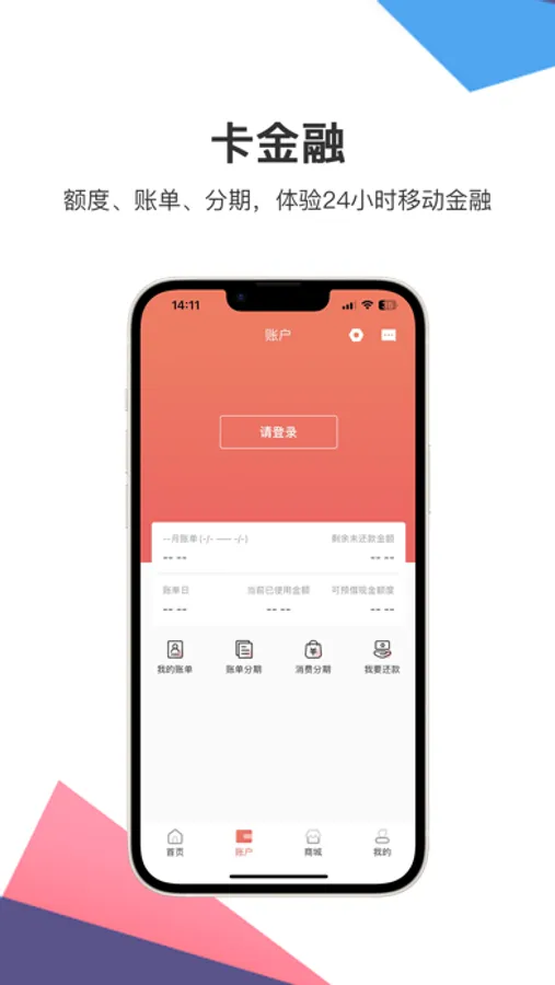 2、“账户”提供账单查询、分期业务、消费分期等功能。
