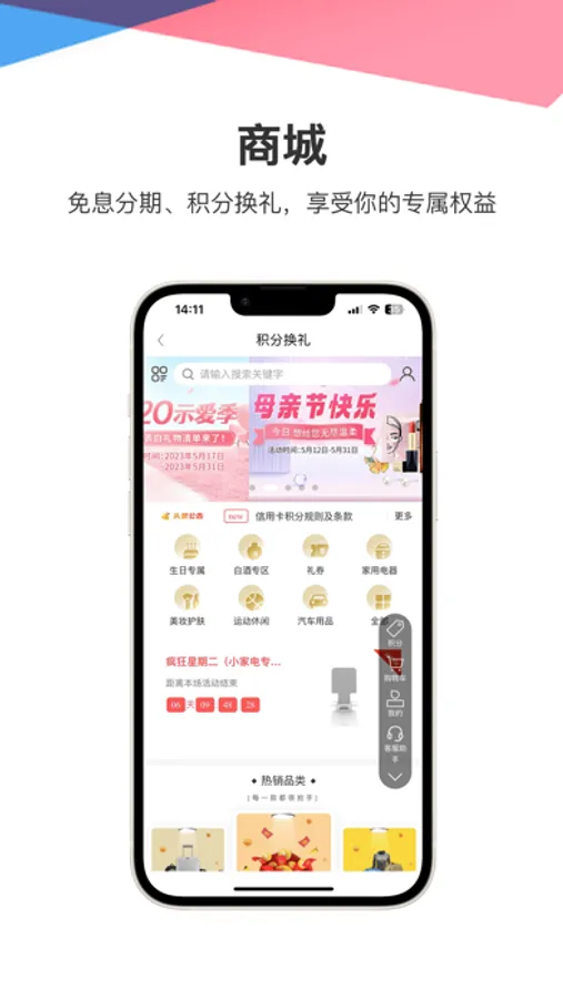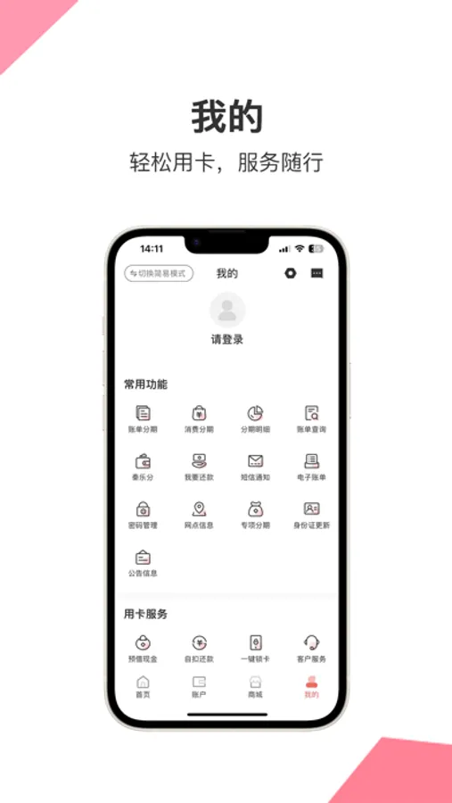 4、“服务”提供卡片推荐、办卡进度查询、卡片激活、自动还款设置、密码管理、电子账单、附卡管理、一键锁卡、网点信息和客户服务等功能。