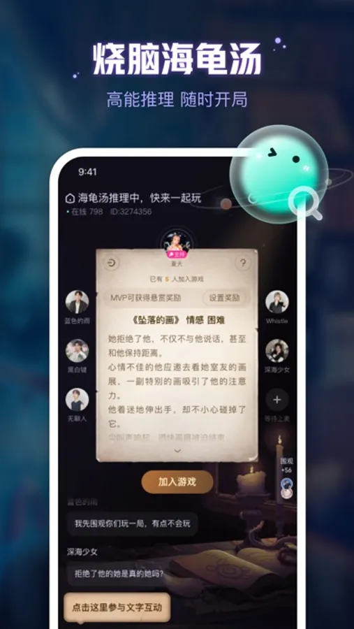 全网爆火的海龟汤解谜,悬疑烧脑,分分钟开局,一局只要几分钟,轻松解压。上万独家精品谜题,沉浸式推理体验,千万小伙伴陪你时而惊悚,时而爆笑,快上车!