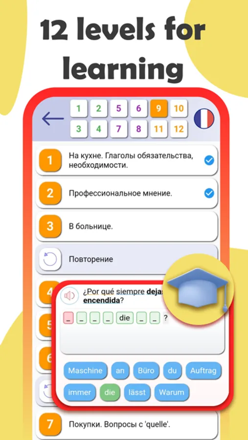 Learning a language with Nextlingua is both fun and useful. The great diversity of interactive exercises, the informative visual dictionary, which is a part of the application, and other didactic resources, will gradually build up your knowledge without much effort on your side and will keep your motivation high.