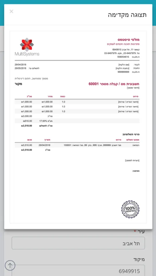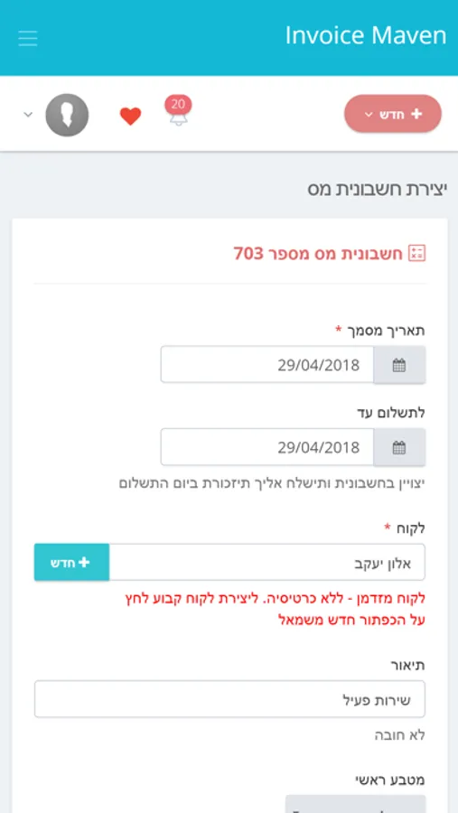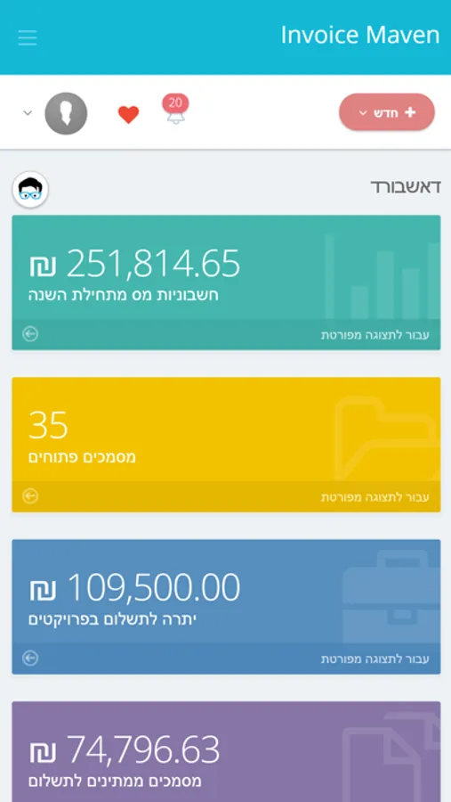 מערכת אינווייס מייבן להפקת חשבוניות דיגיטליות הותאמה במיוחד לעסקים קטנים ונותנת את הכלים לניהול נכון של הכנסות העסק. המערכת נותנת מבט מקיף על הפעילות הכספית של העסק באמצעות דשבורד ייחודי המכיל גרפים ונתונים מסכמים. בנוסף, המערכת מכילה כלים אוטומטיים שיחסכו מכם המון זמן מתהליך ההתחשבנות מול הלקוחות. החל מחשבוניות ריטיינר אוטומטיות ועד לחשבוניות אוטומטיות שיופקו על צ'קים דחויים.