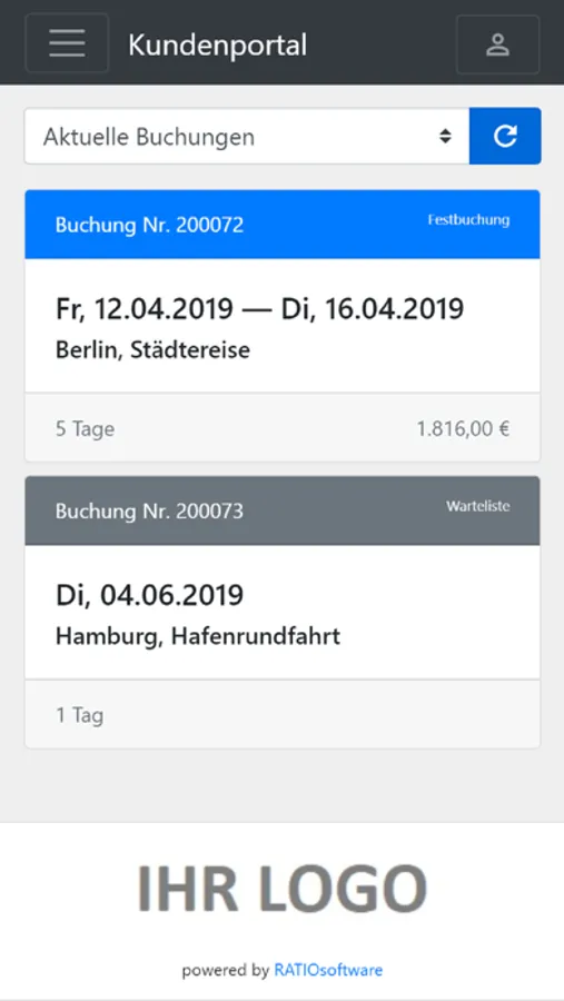 Mit der Kundenportal-App von RATIOsoftware haben Sie Ihre Buchungs- und Reiseinformationen immer dabei.
