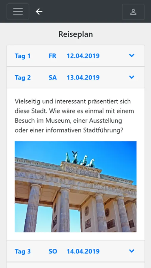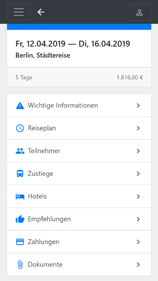 Klicken Sie in der Buchungsübersicht auf eine Buchung, um zur Detailansicht zu wechseln. Dort finden Sie Informationen zum Reiseverlauf, Zustiegsorte und Hotelbeschreibungen. Auch Ihre Buchungsdokumente können Sie hier abrufen.