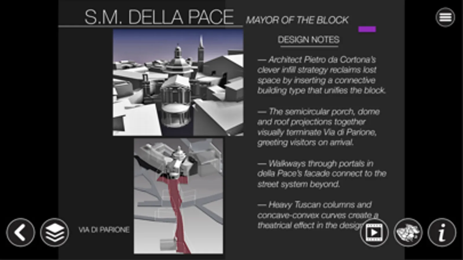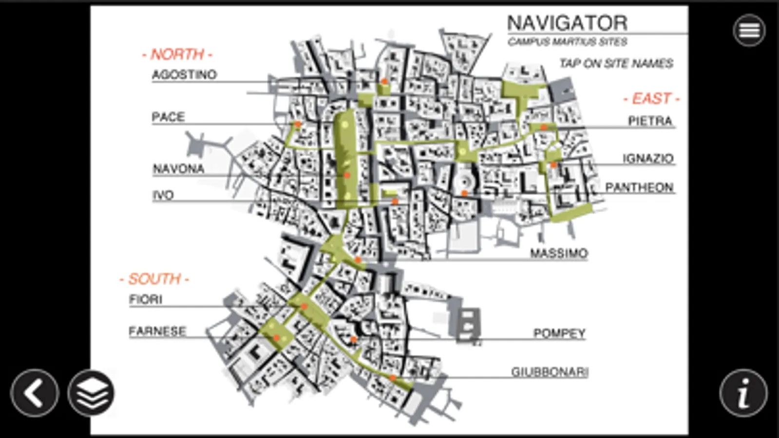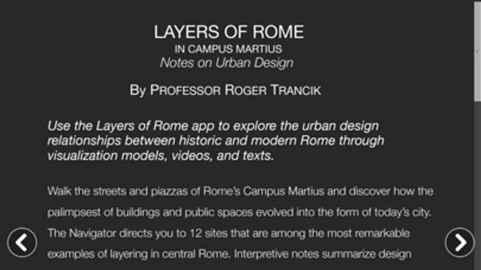 Rome is an exceptional laboratory for the study of urban design. Walk the streets and piazzas with the Layers of Rome app to learn how ancient construction shaped modern urban form. The Navigator Map directs you to 12 sites that are among the most remarkable examples of layering in central Rome’s Campus Martius—a district continuously inhabited, modified and reused for over 2000 years. Experience this urban palimpsest through 3D model animations, narrated videos and texts that amplify spatial design themes for each site.