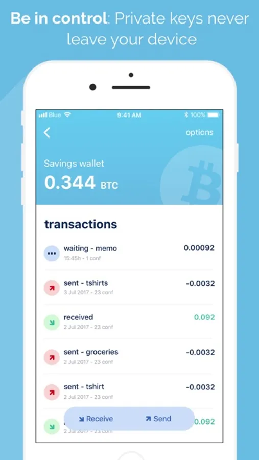 A Bitcoin wallet that allows you to store, send Bitcoin, receive Bitcoin and buy Bitcoin with focus on security and simplicity.