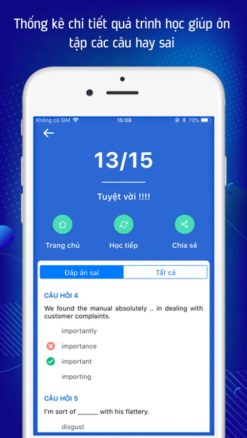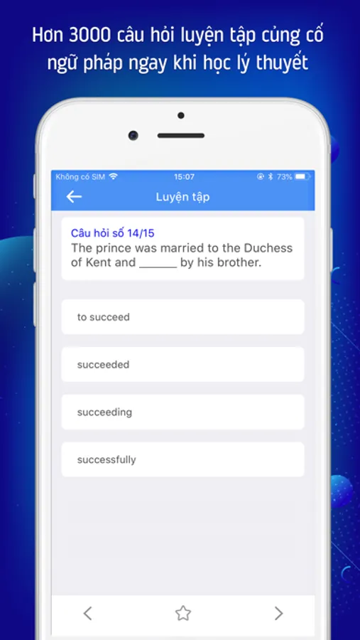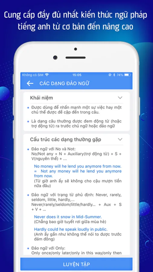 - Ứng dụng tích hợp hơn 3000 câu hỏi luyện tập cho từng chủ đề ngữ pháp.