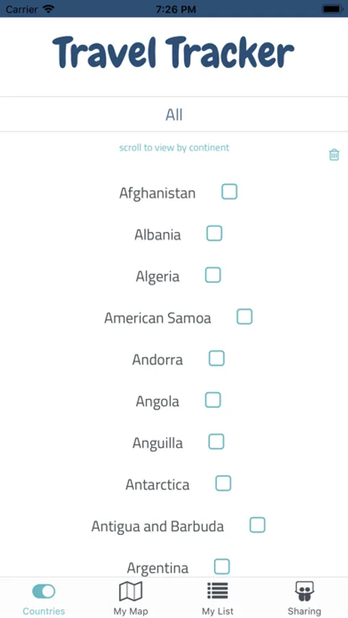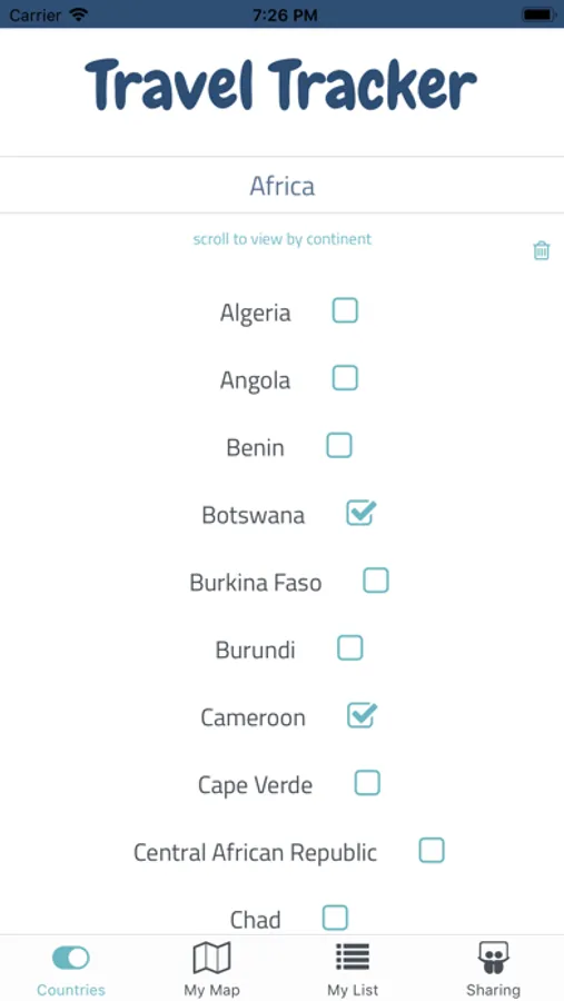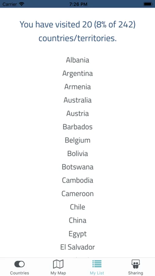 Scroll through 200+ countries/territories and toggle the places that you have visited. View the map or list with your selected countries/territories that you have been to. Share your list with others by creating a username and saving it to our servers.*