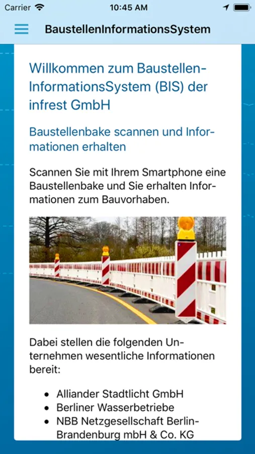 Nutzer müssen dafür lediglich die App herunterladen und an der jeweiligen Baustelle eine DIN-genormte Baustellenbake scannen. Mittels Standortbestimmung per GPS und den Baustellendaten aus dem Baustellenatlas der infrest ermittelt das BIS die jeweilige Baustelle. Informiert werden die Nutzer über die Bezeichnung – wie z. B. Reparaturarbeiten am Wassernetz – und das geplante Bau-Ende. Bei den fünf genannten Infrastrukturbetreibern wird zudem die Sparte – beispielsweise Wasser/Abwasser – und der Auftraggeber der Baustelle angezeigt. Wo eine Baustelle erkannt wird, bietet die App die Möglichkeit, einen der o.g. an den Arbeiten beteiligten Infrastrukturbetreiber zu kontaktieren und Hinweise und Fragen zu übermitteln.