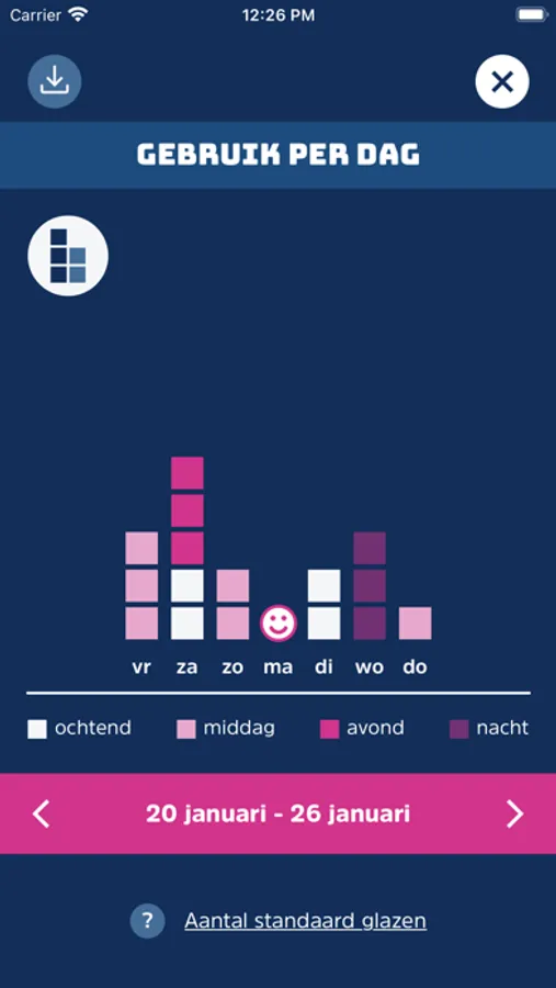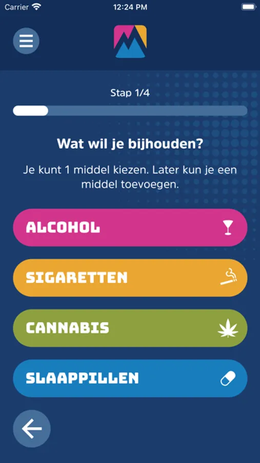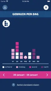 De Middelenmeter helpt je bij het registeren van gebruik van alcohol, tabak, cannabis en/of slaap- en kalmeringsmiddelen. Met de Middelenmeter houd je voor een periode van 1, 2, 3 of 4 weken je gebruik bij. Dit kan ook van meerdere middelen tegelijk. Je gebruik kun je per dag of per dagdeel aangeven. Het gebruik van de app is geheel gratis.