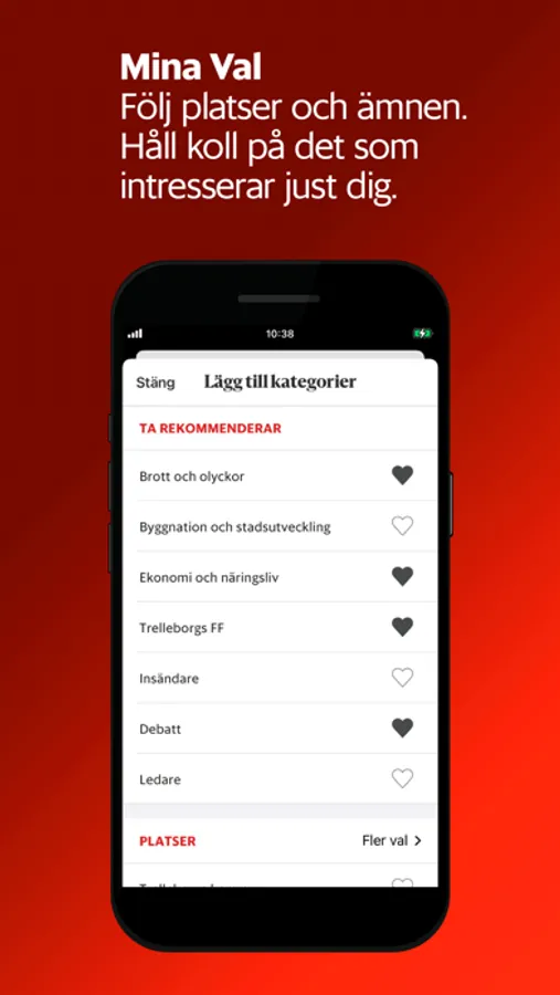 Under Mina val väljer du själv vilket innehåll du vill se i ditt nyhetsflöde. Du kan göra val utifrån geografi och intressen och väljer också om du vill ha pushnotiser så fort det publiceras nyheter i något av de ämnen du valt.