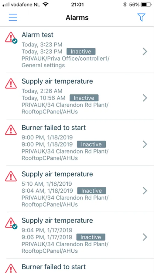 With Priva Alarms, the alarm information of your Priva systems is available anywhere, at any time. The Priva Alarms application provides an overview of the alarms in the Priva systems in your Buildings and/or Greenhouses and offers greater insight and flexibility on the go. It alerts you when an alarm occurs and offers detailed information on the nature of the alert.