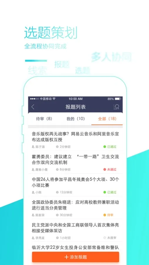 线索 - 报题 - 选题 - 分发任务 - 协同完成。轻松玩转选题策划全流程,过程可控,关键数据实时跟踪