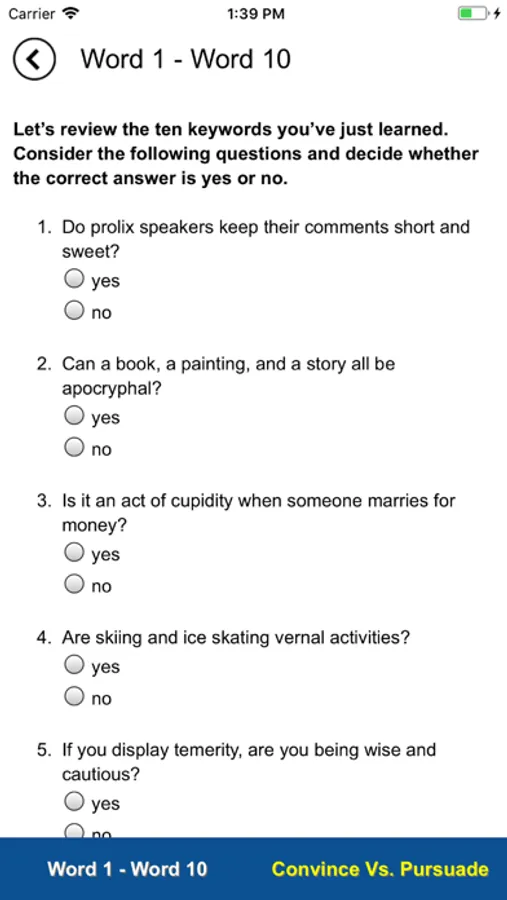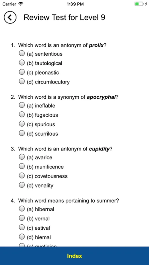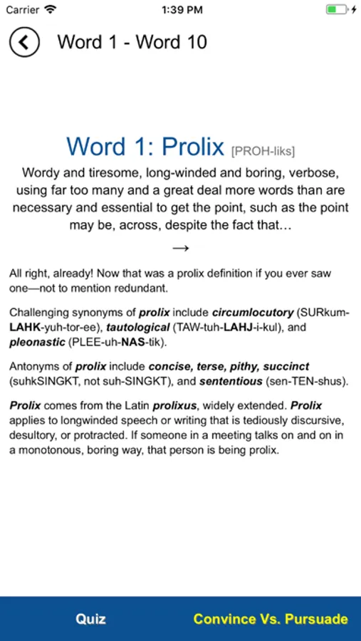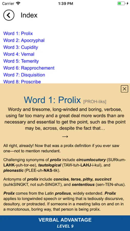 You will proceed through ten levels of vocabulary, each level more challenging than the last. For example, Level 1 contains words familiar to about 60 to 70 percent of adults—that is, words known to many high school graduates and most college graduates. By the end of Level 5 you will have raised your vocabulary to about the 75th percentile—the top quarter of all educated adults. By the end of Level 8 your vocabulary will have surpassed that of most executives and professionals, including those with advanced degrees. And when you complete the tenth and final level you will have progressed beyond 95 percent of the entire population. You will command an armory of words that only a handful of people in every thousand can match.