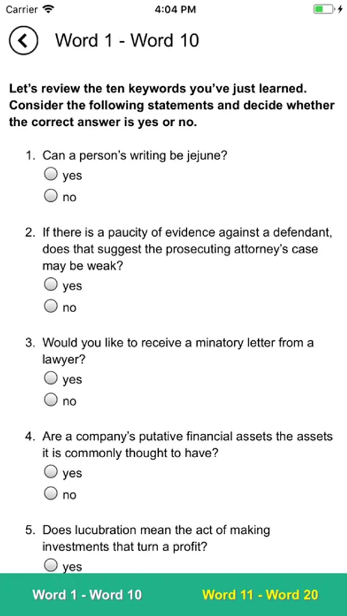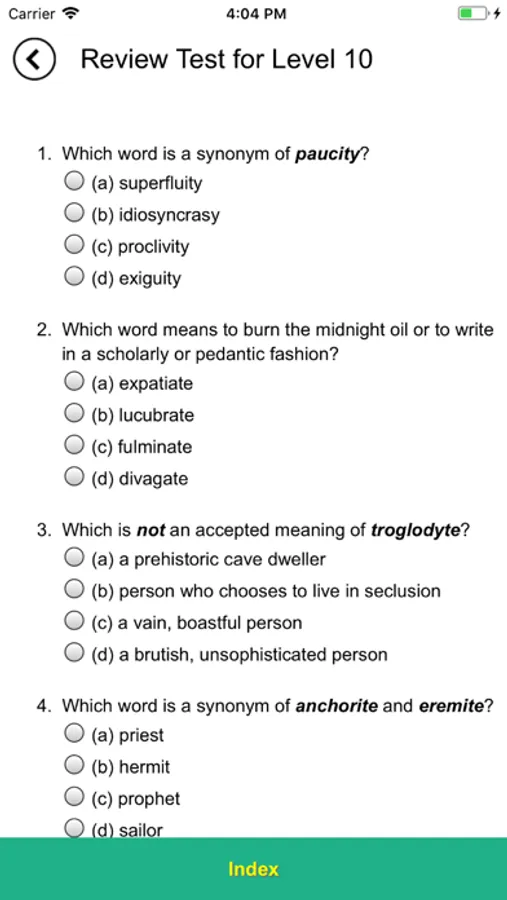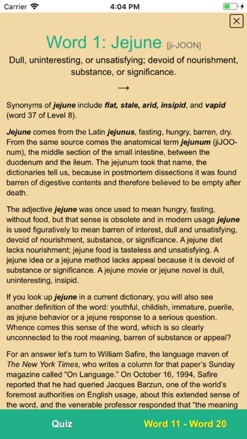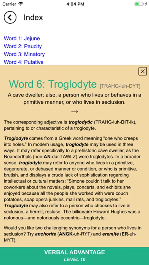 You will proceed through ten levels of vocabulary, each level more challenging than the last. For example, Level 1 contains words familiar to about 60 to 70 percent of adults—that is, words known to many high school graduates and most college graduates. By the end of Level 5 you will have raised your vocabulary to about the 75th percentile—the top quarter of all educated adults. By the end of Level 8 your vocabulary will have surpassed that of most executives and professionals, including those with advanced degrees. And when you complete the tenth and final level you will have progressed beyond 95 percent of the entire population. You will command an armory of words that only a handful of people in every thousand can match.