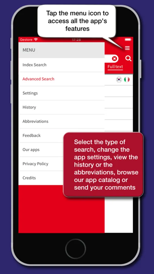 The app's interface has been redesigned to provide a simpler and more intuitive experience. Each definition can be shared using the features available in the device, such as social media, e-mail, SMS, cloud. A main menu that can be activated via an icon available at the top right of the screen enables all the features of the app: