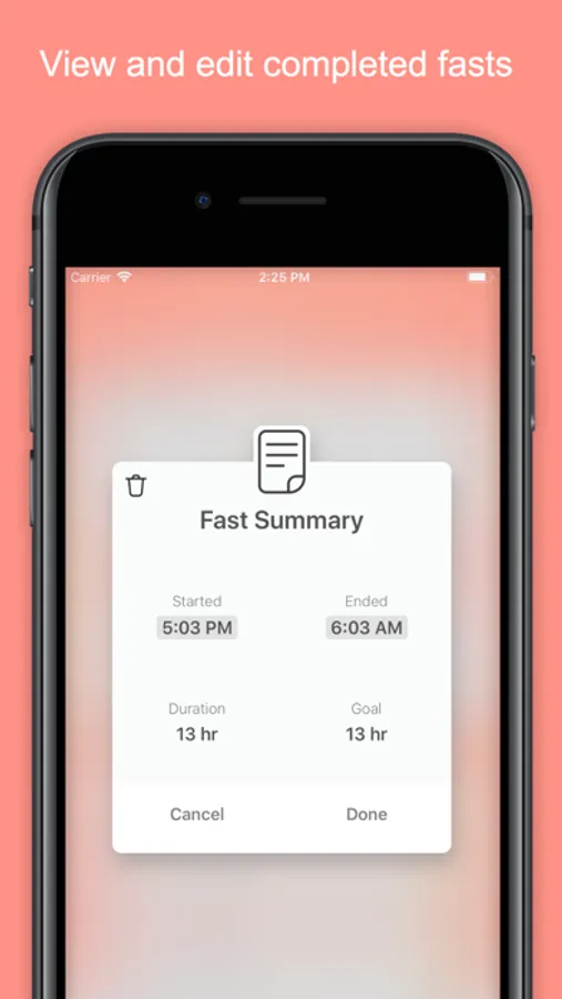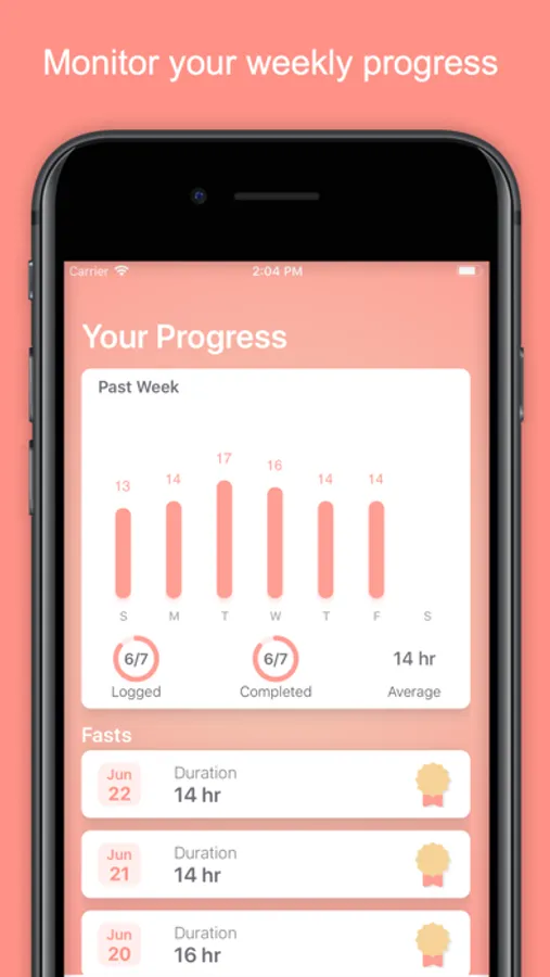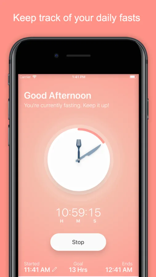 Set up and save your daily fasting goal, when you are ready to get started just initiate with one click. Through the day check your progress and over several days you can see a rhythm starting. You can get notified when you've completed your fast by enabling the feature in the apps settings.
