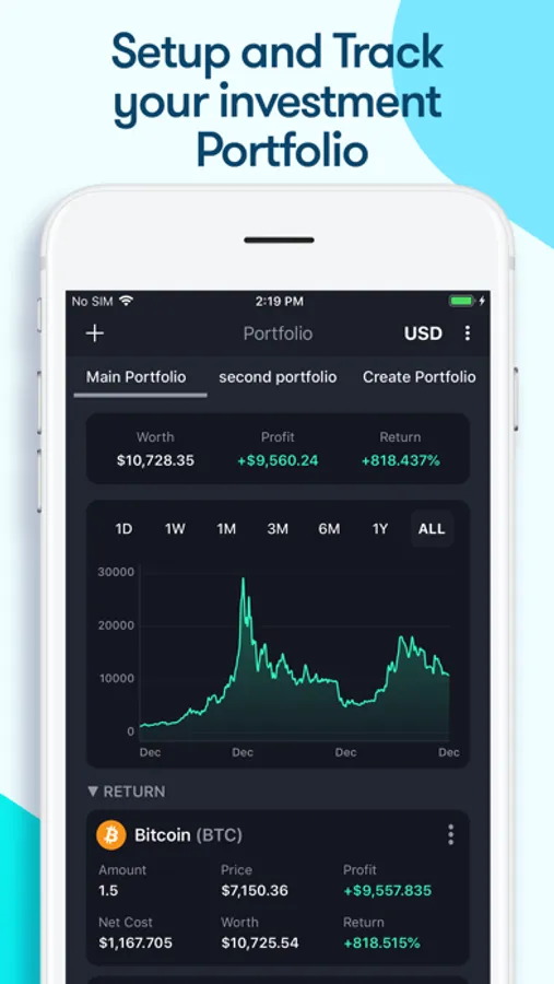 Easily set up your investment portfolio and always have a clear overview of its current state. Get valuable insights about your portfolio such as total portfolio balance, its composition, your profit/loss, as well as return from the portfolio as a whole and by each cryptocurrency separately during various time periods.