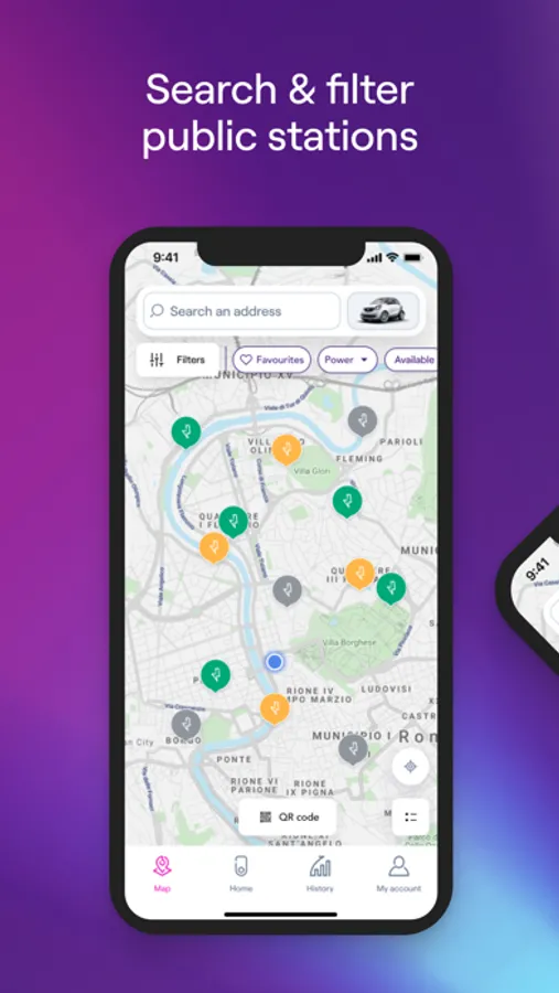 Enel X Way mobile app allows you to manage all your electric or plug-in hybrid car’s charging needs from wherever you are. You can search and filter nearby charging stations based on availability, max charging power, or plug type with the live map. Download the app for free and register in just a few clicks.