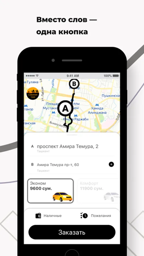 Воспользуйтесь простым и удобным способом заказа такси в Андижане, Бухаре, Гулистане, Джиззах, Карши, Навои, Намангане, Нукусе, Самарканде, Ташкенте, Термизе, Ургенче, Фергане. С мобильным приложением — Caravan taxi всегда под рукой
